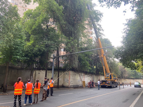 社区建设办公室迅速联系学校后勤保障部绿化、修缮中心、玉林街道办事处城管执法大队、城管科及黉门街社区等相关单位工作人员到多次现场查勘,研究排危方案,制定危树和围墙“分步走”的排危计划。在方案与计划报玉林街道办事处城管执法大队和城管科备案后,于5月23日早上,先对该棵倾斜的危树进行了处理,消除危树带来的安全隐患。6月15日开始,对该段围墙开展排危工程,全力保障居民居家安全及行人、车辆的安全。