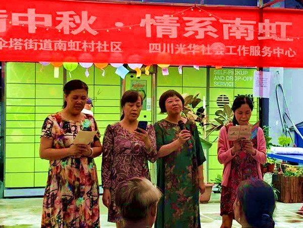 南虹村社区李先成主任首先向现场居民致以节日问候,并希望广大居民朋友继续积极参与和谐社区共建共享。大学路1号小区业委会主任游素群介绍了小区公共区域打造工作,对南虹村社区表示了感谢。随后大学路号小区业委会代表带来了精彩的诗朗诵,居民们带来了自主编排的各类歌舞表演。同时,四川光华社会工作服务中心组织开展的小游戏使居民欢聚一堂,将欢声笑语洒满小区。