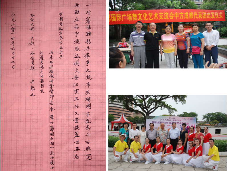此次国际广场舞文化艺术交流从6月26日至7月1日历时6天。6月25日中方在成都举办了槟城--成都国际广场舞文化艺术交流会中方成都代表团出发仪式,在出发仪式上玉林北路社区向书记代表中方给每一位出访槟城的党员佩戴了党徽,提前庆祝了中国共产党成立95周年,代表团的党员,代表全体出访团员接受了党组织的重托,并表示一定不负众望,保质保量的完成出访任务(见图)。6月27日晚,马方为中方代表举办了欢迎晚宴和浓郁的马来西亚民俗、民风文艺演出,马来西亚槟城州拿督许岳金先生代表马方给53位代表逐一赠送了纪念品和所作诗词(见图)并发表了出自肺腑、热情洋溢的演讲,表达了一位资深华人对祖国的眷恋和海外游子求生存、谋发展的艰辛及与中华同胞同呼吸、共命运、共成长的血肉之情。他的爱国爱家之心、激烈澎湃的演讲,深深地打动了出席晚宴的每一位中方代表。