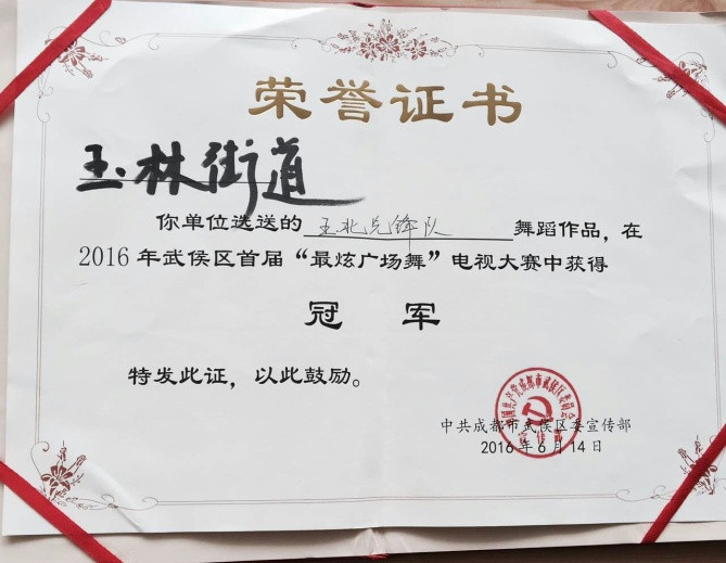 金秋艺术团舞蹈队于2016年6月14日在武候区宣传部主办的首届“最炫广場舞”电視大赛暨首届中国(成都)馬耒西亞(槟城)广埸舞文化艺术交流选拔赛中,代表玉林街道办玉林北路社区广场舞先锋队以舞蹈“炫夕阳”获“最炫广场舞”电视大赛决赛冠軍,拿到了代表中国(成都)赴马来西亚(槟城)参加文化交流活动的大奖。全队表示:一定不负重托,出色完成本次赴马来西亚(槟城)文化艺术节交流任务。