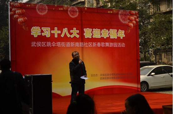 1月24日下午14:00,“学习十八大,喜迎幸福年——武侯区跳伞塔街道新南路社区新春歌舞游园活动”在大学路12号小区内举行,本次活动由跳伞塔街道党委及新南路社区居民委员会主办,大学路12号小区业主委员会和物业服务站协办。