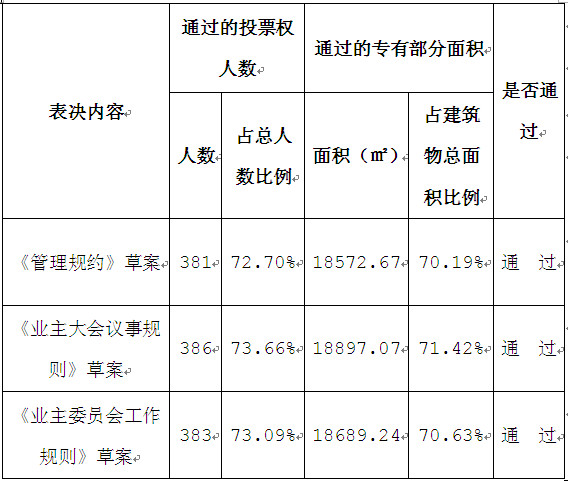 大学路1号小区建筑区划业主大会会议,在武侯区跳伞塔街道办事处的组织下,在南虹村社区与四川大学指导监督下,于2015年5月7日至2015年5月10日在大学路1号院内举行。大学路1号投票权人数共计524个,专有部分面积共计26459.83㎡,共发放《管理规约》、《业主大会议事规则》、《业主委员会工作规则》三个基础性公约表决票396张,收回表决票396张,其中有效票386张,废票8张,弃权票2张。发放选举产生业主委员会表决票390张,其中有效票387张,废票3张。本次业主大会会议表决通过《管理规约》、《业主大会议事规则》、《业主委员会工作规则》的具体情况见附表1,选举业主委员会委员的具体情况见附表2。