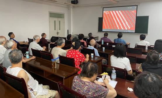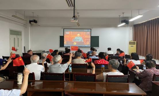 文华309会议室,老党员们和在职同志一起集中收看庆祝中国共产党成立100周年大会实况直播。观看过程中,大家聚精会神,认真记录讲话要点,听到精彩之处,还不时地爆发出阵阵掌声,对中国共产党百年华诞感到欢心鼓舞,对建党百年来取得的伟大成就倍感振奋,对党和国家未来发展,对中华民族伟大复兴充满信心。