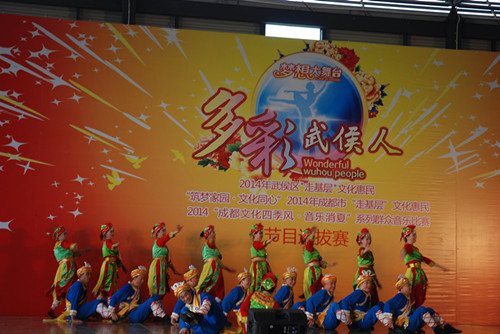 按照成都市、区委宣传部的要求,成都市武侯区委宣传部主办的,武侯区文联,文化旅游局及文明办联合承办的,武侯区人民政府各街道办协办的,武侯区文化馆执行的2014武侯区“走基层”文化惠民“筑梦家园,文化同心”、2014成都市“走基层”文化惠民、2014成都文化四季风“音乐消厦”系列群众音乐比赛“多彩武侯人综艺节目”选拔赛,经6月报名、初审,武侯区玉林街道办、望江路街道办、簇桥街道办和金花街道办等武侯13个街道办以及直通节目组的说唱、曲艺小品、戏曲、器乐、时装和舞蹈等72个节目(其中舞蹈25个)于2014年7月17、18日在簇桥武侯高级中学演出厅正式展开比赛。